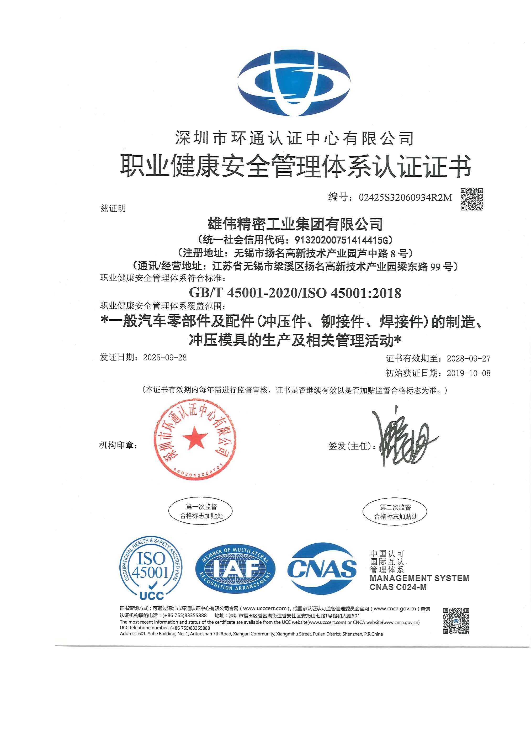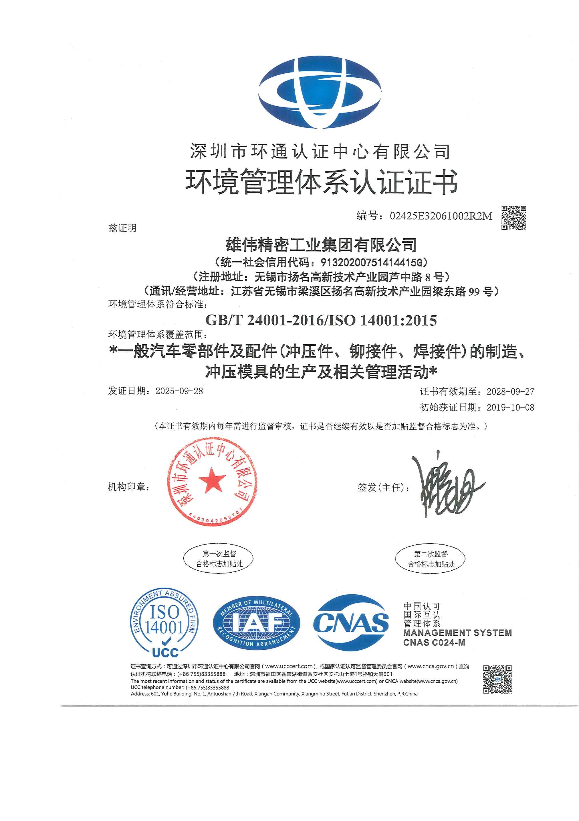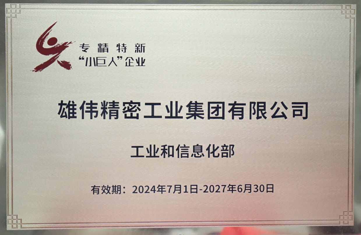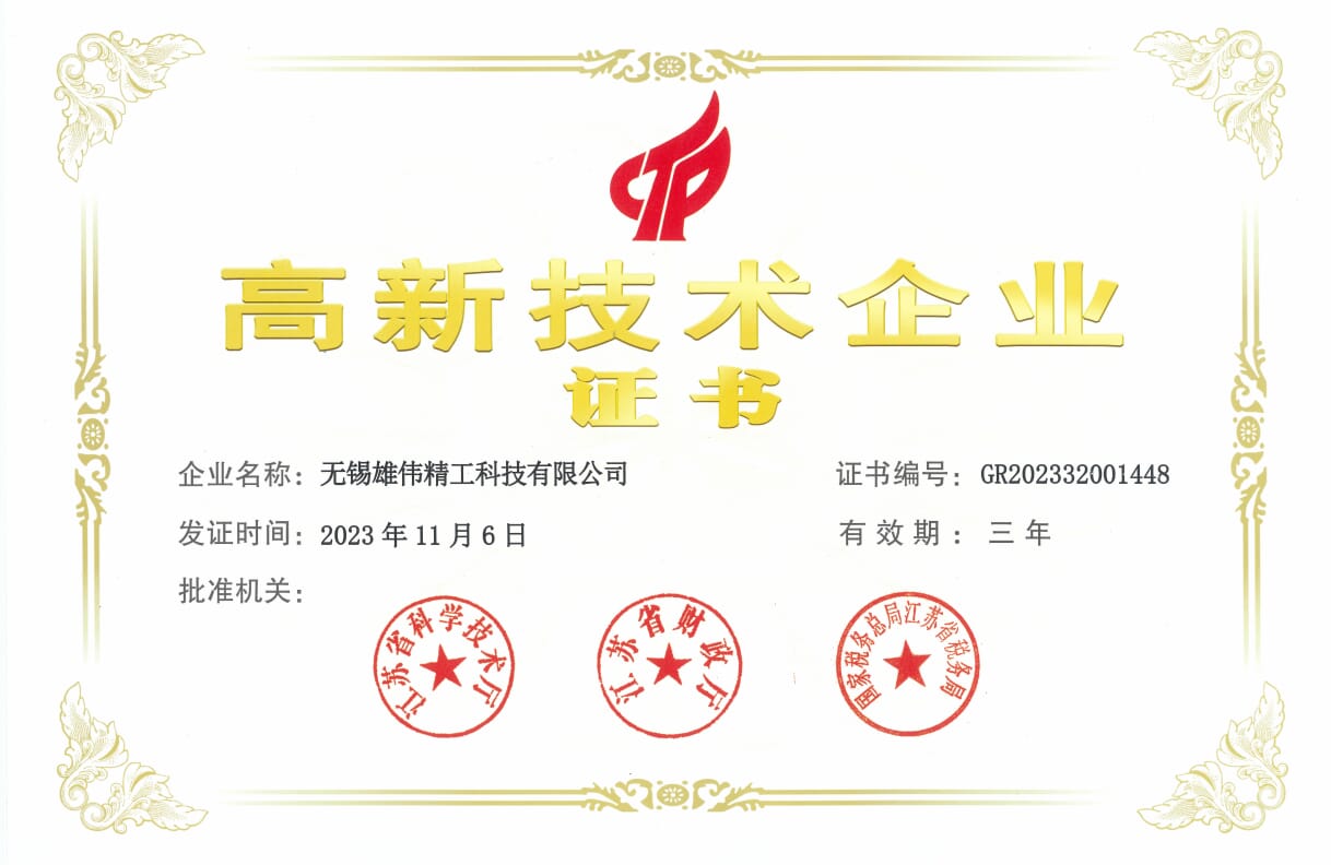 雄伟精密工业集团有限公司为国家级高新技术企业、国家级专精特新“小巨人”企业、江苏省企业技术中心、无锡市绿色工厂,曾获得无锡市市长质量奖“优秀管理奖”