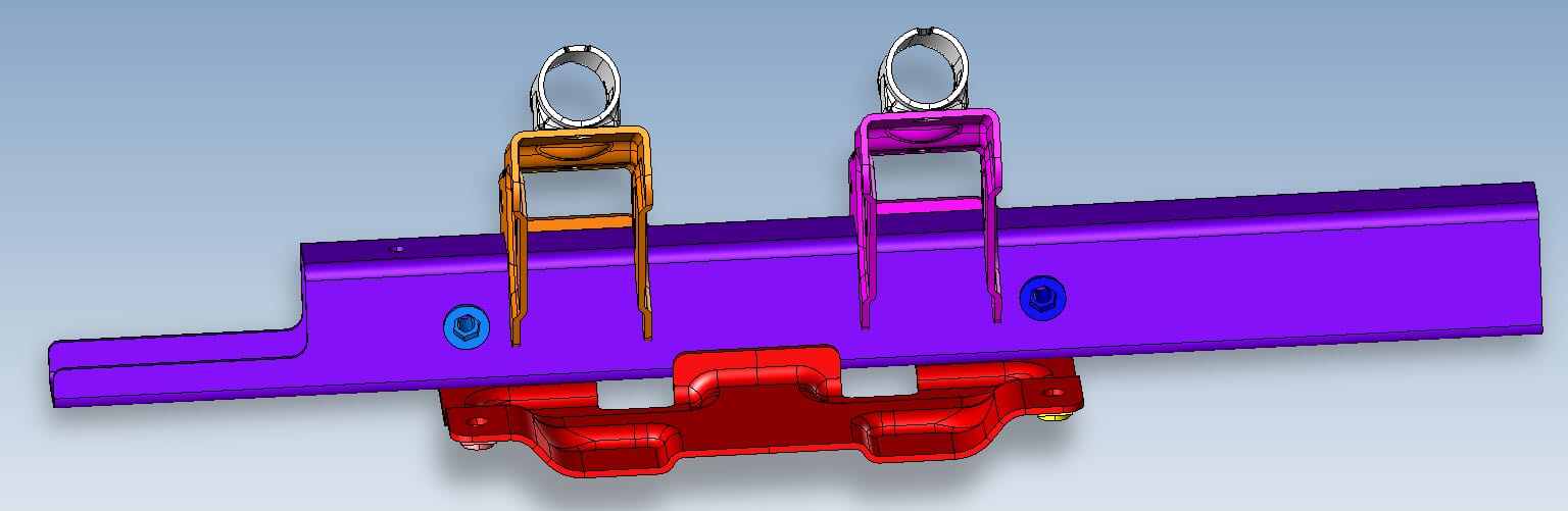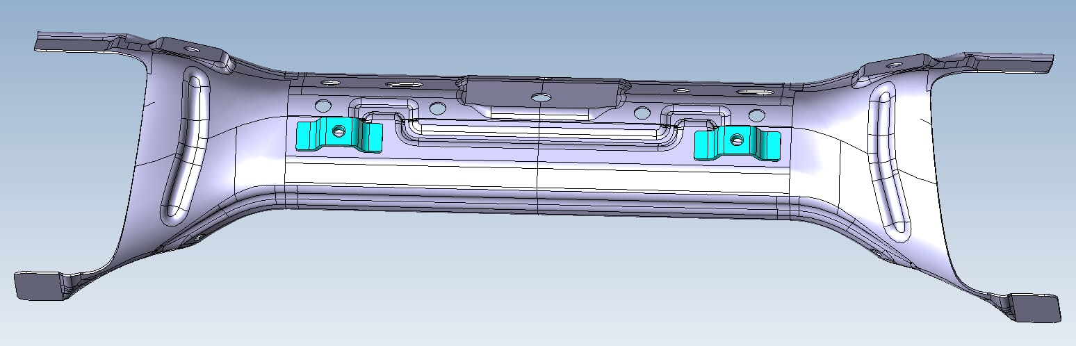 汽车二排腿托固定支架总成,工艺涉及冲压、铆压、激光打码,用于固定腿托