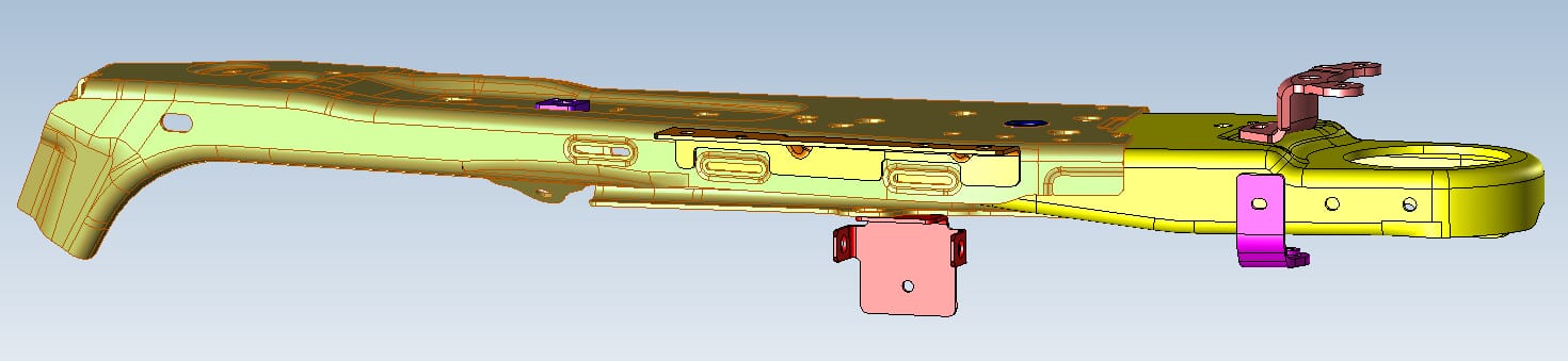 汽车前排坐垫侧板总成,工艺涉及冲压、铆压、点焊、烧焊