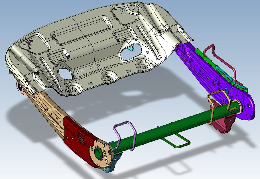 汽车二排坐盆总成,工艺涉及冲压、铆压、焊接、电泳,具备抬升调节功能